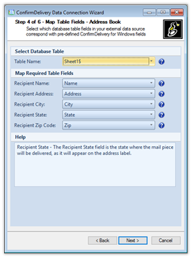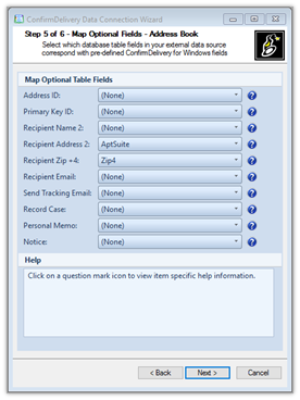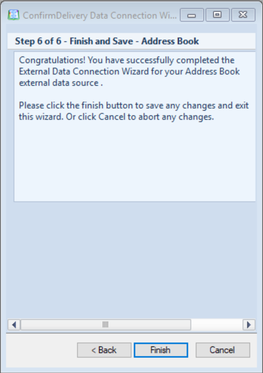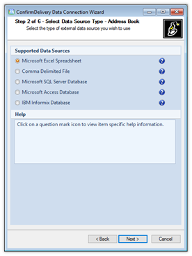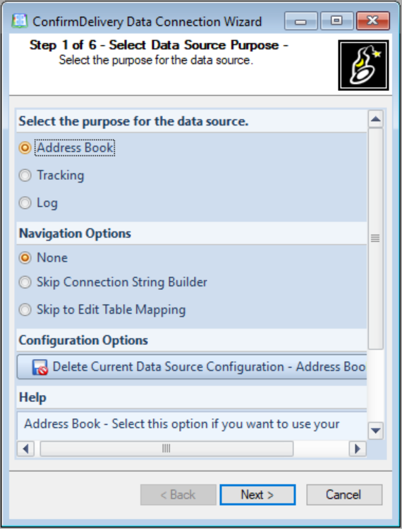 | 4) In Select the purpose for the data source, select Address Book 5) Click Next | ![]() |