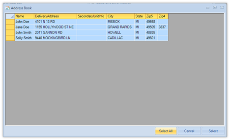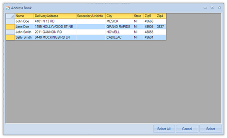 | 4) To select all addresses that were imported, click Select All at the bottom of the window | |