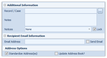| 8) Enter information into the Additional Information and Recipient Email Information sections if applicable and specify whether the address will be standardized in the Address Options section | |