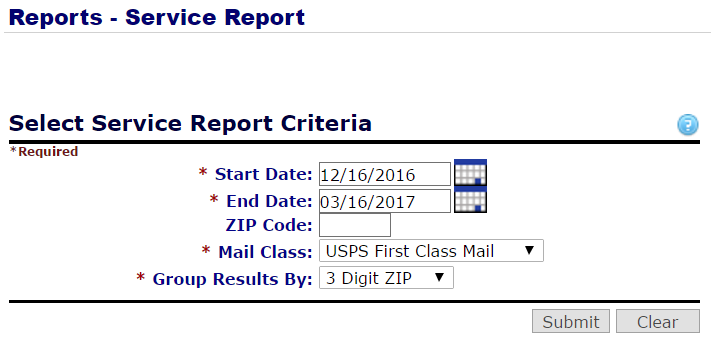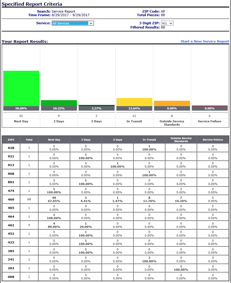 Service ReportsA service Report displays delivery performance of postal areas to help identify problem areas.Reports can be generated either for a specific ZIP code or for a 3-digit ZIP code range. | ![]() |