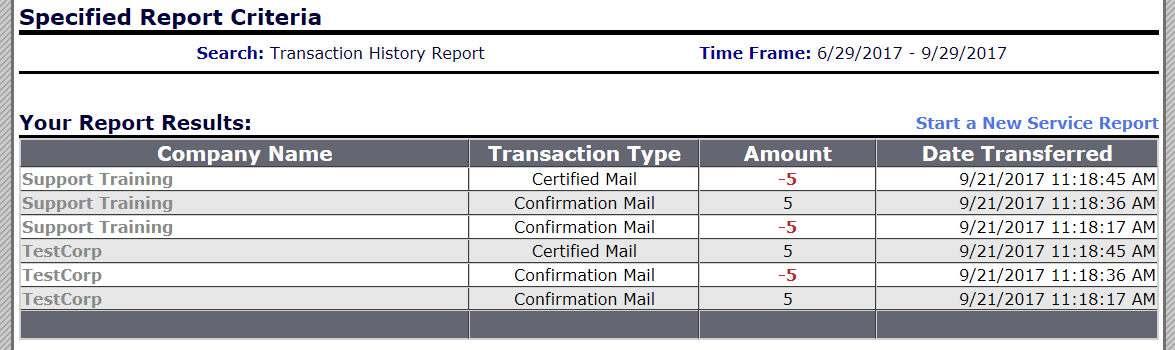 | A transaction History Report displays transaction activity for the current account and any account directly beneath them. | ![]() |