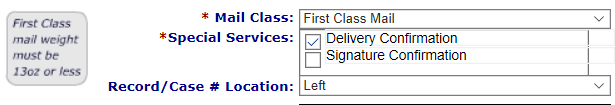 | 5) Select the appropriate mail class from the drop-down list. 6) Check the special services you wish to include. | Confirmation Mail ![]() Certified Mail ![]() |