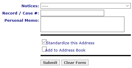 | 8) If a notice is required, select it from the "Notices" drop-down list. 9) Enter the Record/Case# if applicable. 10) If desired, add notes in the "Personal Memo" field. these notes will NOT appear on the mail piece, but the creating account and its parent account(s) will see the memo in Mailing History and Track Mail results. 11) To prevent a validation check being performed on an address, uncheck the "Standardize this Address" box, which is selected by default. 12) Select "Add to Address Book" to save the address to the address book. A Record/Case# value will be saved with the address entry. | ![]() |