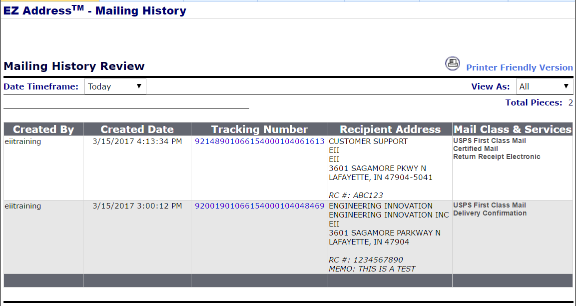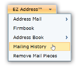 | he Mailing History page provides a quick overview of pieces that have been crated using EZ-Confirm. To reach the Mailing HistoryI page, hover over the EZ Address tab in the main tool bar and select the Mailing History tab. | ![]() |