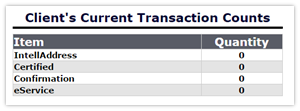 Transactions are electronic vouchers that are purchased by customers and consumed when addressing mail pieces. Transactions are specific to mail type, specifically "Confirmation Mail" and "Certified Mail." A counter showing the available transactions by type is located near the top right corner of the screen. Transaction types will only be shown in this counter if the number of remaining transactions is greater than zero.