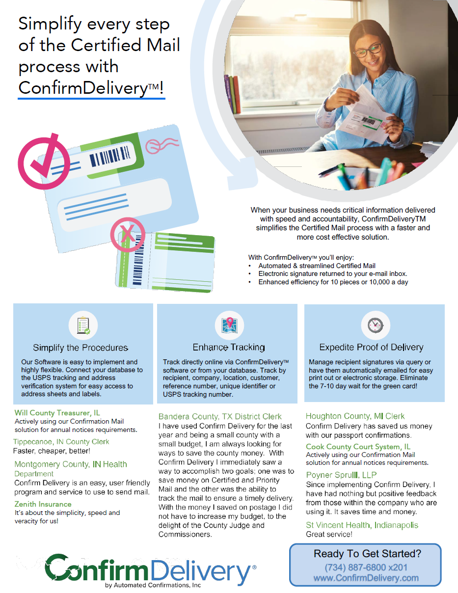 When your business needs critical information delivered with speed and accountability, ConfirmDelivery simplifies the Certified Mail process with a faster and more cost-effective solution.